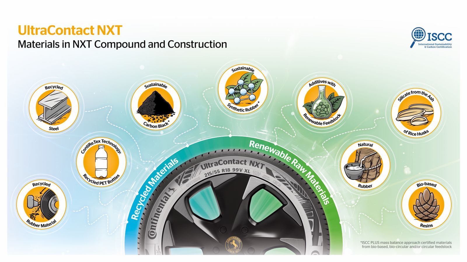 يتميّز UltraContact NXT، وفقاً لحجم الإطار، بكونه مصنوعاً مما يصل إلى 65 بالمئة من المواد المتجدّدة والمُعاد تدويرها والمُصادَق عليها من ناحية توازن الكتلة. فالمواد المتجدّدة تشكّل نسبة 32 بالمئة. أما حصّة المواد المُعاد تدويرها فتصل إلى 5 بالمئة. علاوة على هذا، حصلت ’كونتيننتال‘ على كمّية وصلت إلى 28 بالمئة من المواد المتوافقة مع معايير ISCC PLUS لتوازن الكتلة فيما يتعلّق بالمواد الخام الحيوية، الحيوية الدائرية و/أو الدائرية.