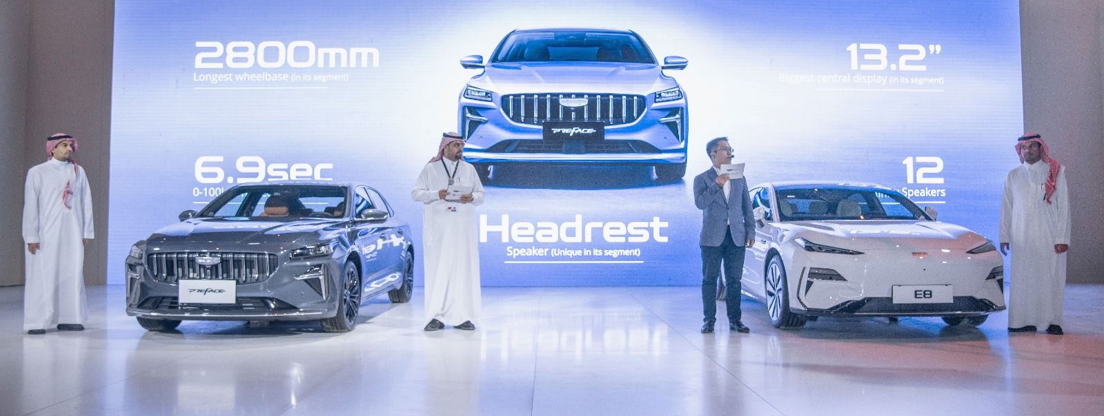 الرياض، المملكة العربية السعودية – في عرض ضخم بمعرض الرياض للسيارات والذي يُعقد في أرينا المملكة في الخامس من ديسمبر، كشفت جيلي الوعلان للعالم عن أحدث سياراتها الكهربائية المميزة؛ طراز E8 ال Prefaceوطراز Emgrand Methanol.