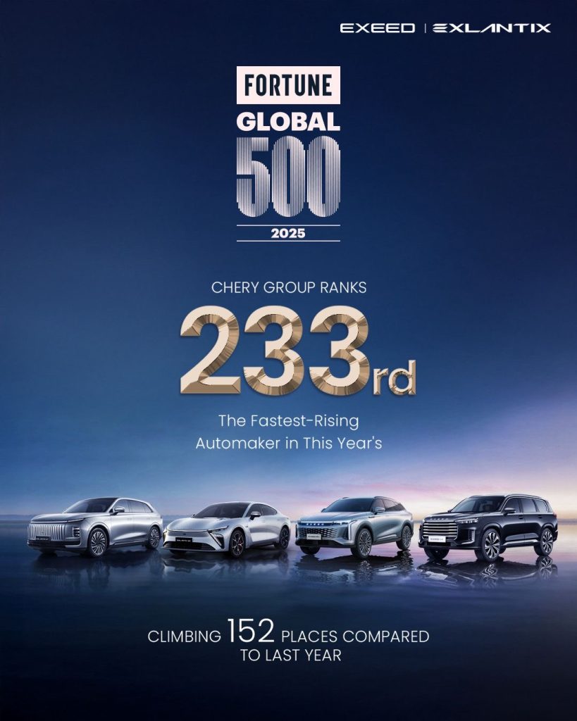 في 29 يوليو، تم الإعلان رسميًا عن قائمة فورتشن جلوبال 500 لعام 2025 على مستوى العالم. وقد قفزت مجموعة شيري القابضة إلى المركز 233 بعد أن تقدمت 152 مرتبة مقارنة بعام 2024، لتصبح أسرع شركات صناعة السيارات صعودًا خلال العام. وفي الوقت ذاته، تجاوزت صادرات شيري التراكمية من السيارات حاجز 5 ملايين مركبة، محافظة على موقعها كأكبر مُصدّر سيارات في الصين.